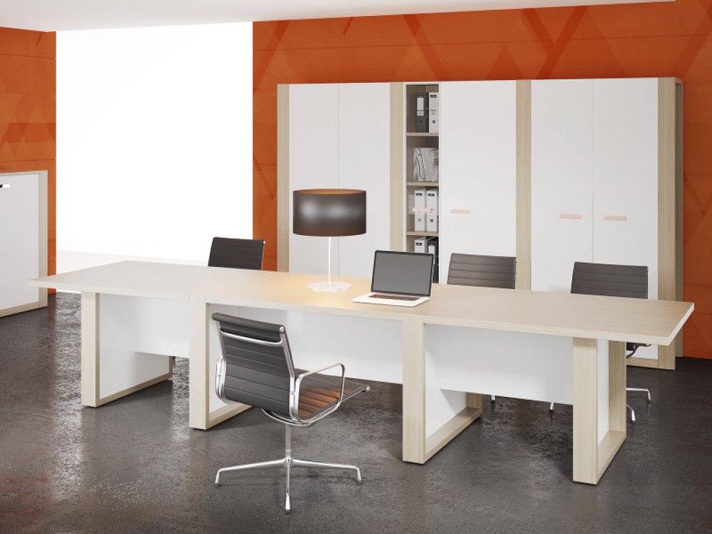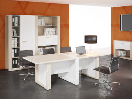 - Применение квадратных опор замкнутого контура со вставками белого цвета, а также применение диодной подсветки каркаса столов руководителя придает коллекции изящество и визуальную легкость конструкции;